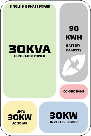 This innovative FLX30 combines an 30kVA diesel generator, 90kWh of advanced battery storage, a robust 30kVA inverter (Available as single or 3 Phase), and up to 30kWp of AC-Solar input. Whether you’re powering your home, business, or off-grid adventures, this unit delivers seamless, reliable energy, day and night. Maximize efficiency by harnessing solar energy during the day, store it in the high-capacity batteries, and rely on the powerful diesel generator for backup when needed. Designed for durability, versatility, and sustainability, this system ensures uninterrupted power with reduced fuel consumption and environmental impact.