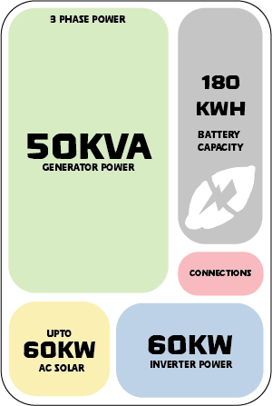 This innovative FLEX50 combines an 50kVA Isuzu diesel generator, 180kWh of advanced battery storage, a robust 60kVA inverter, and up to 60kWp of AC-Solar input. Whether you’re powering your home, business, or off-grid adventures, this unit delivers seamless, reliable energy, day and night. Maximize efficiency by harnessing solar energy during the day, store it in the high-capacity batteries, and rely on the powerful diesel generator for backup when needed. Designed for durability, versatility, and sustainability, this system ensures uninterrupted power with reduced fuel consumption and environmental impact.