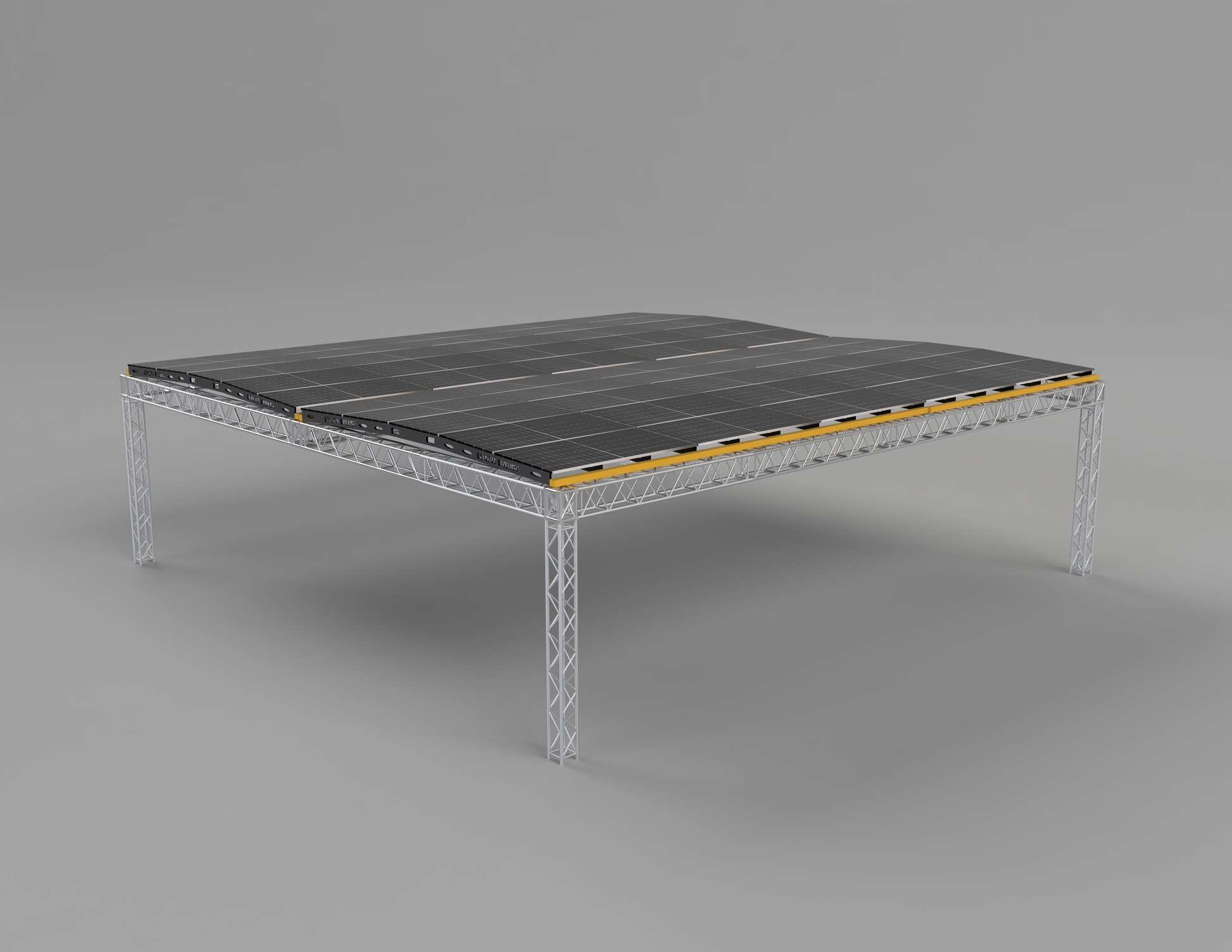 Our Solar Truss module is a fully aluminium unit that spans 6m between supports. Each module has 5 PV Panels giving a huge 3.2kWp of output. This allows a 12m x 12m Aluminium truss grid with just one central support. The kit utilises 280x380 rectangular truss to span the 12m distances between post while supporting the full 10 panels and 32.3kWp of solar above it.