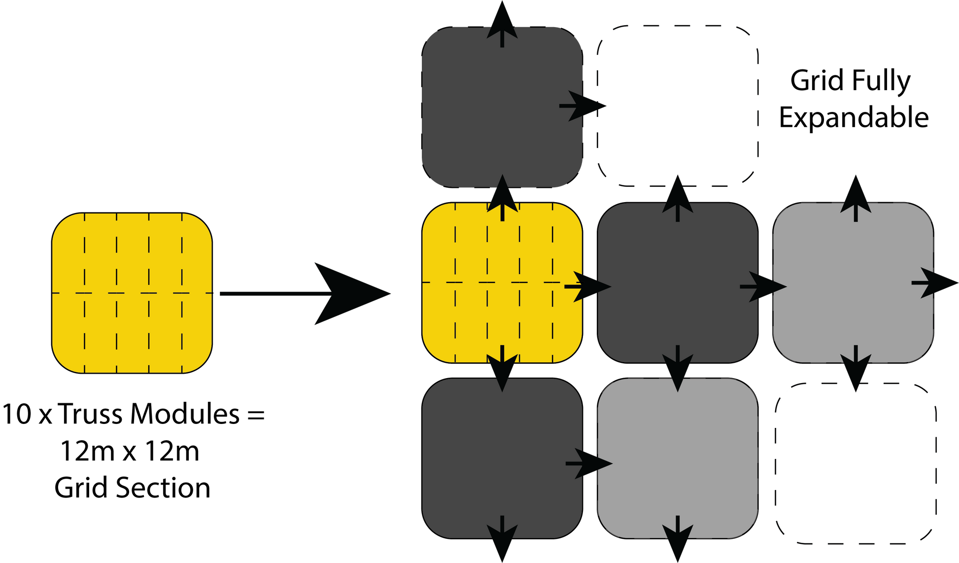 Fully extendable allowing huge covered area to be created to facilitate vast uses. with a 12x12m grid for supports maximum versatility can be maintained. larger spans are possible with different truss sections. Contact us for custom solutions.
